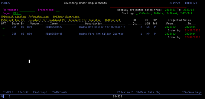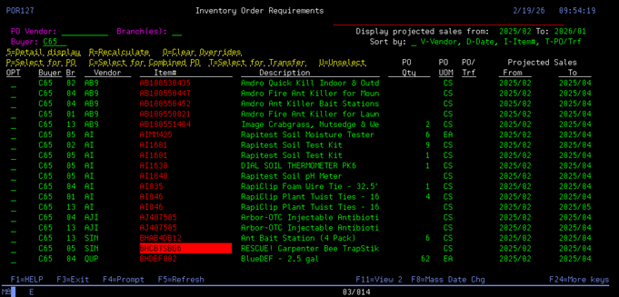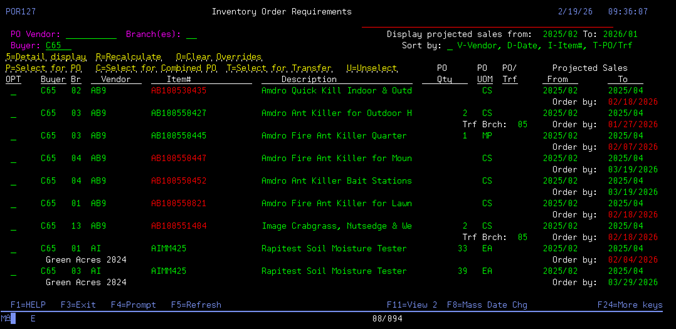 On each items line you can: 5-Detail display, R-Recalculate, O- Clear Overrides, P- Select for PO, C- Select for Combined PO, T- Select for transfer, and U- Unselect.