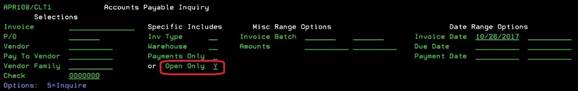 · If you want to view all Open Invoices, place a Y in the Open Only field and leave Amount fields blank.