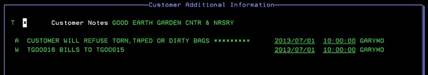 shows all available Customer notes stored for this particular customer. This display is for viewing only. Pressing any key will return you to the previous