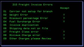 PLEASE NOTE** You can lessen the number of invoices that appear on this error screen. See Menu 1606 to setup your “acceptable variances” for automatic invoice approval for each Motor Freight Vendor. If those values are “0”, you will have to approve every invoice manually.