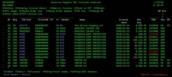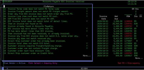 The AP EDI Invoices Received Screen displays all EDI invoices received from our Vendors. This screen is quite comprehensive and is the “hub” of the EDI invoice processing. This menu option shows: invoices with errors, invoices processed, links to purchase orders and RVI invoice images and much more.