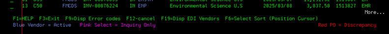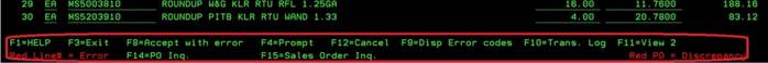 PINK Underline Option: If the Option Field to the left of the invoice line is not green, but PINK, you are not the original buyer or Branch for this order. The Branch/Twig users may not make any changes to the invoice, or the Purchase Order and Sales Order thru the Menu 4190 screen. They will also not be allowed to push an invoice to Accounts Payable. This option allows Branch/Twig users to inquire into the EDI invoice detail (including any processing notes), Purchase Order, or Direct Ship Sales Order that they did not originally enter.