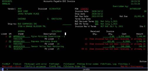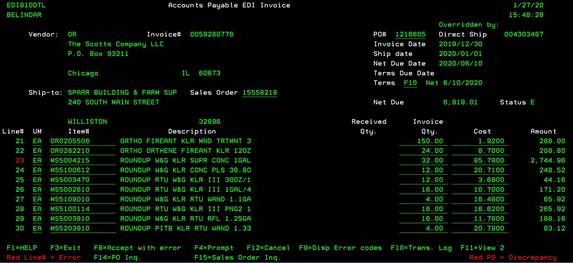 store the Direct Ship Sales Order with the vendor EDI invoice data. In the 4190 invoice detail screen