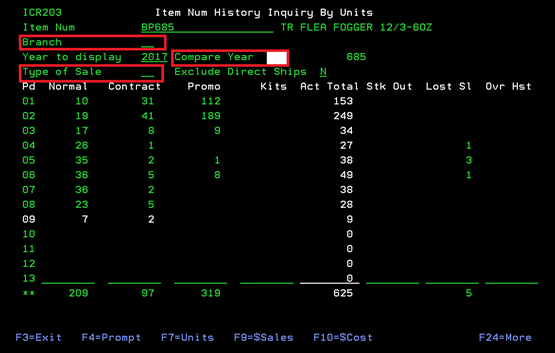 require data in Compare Year field): F4-Prompt on Item# or Branch fields, F7-Unit