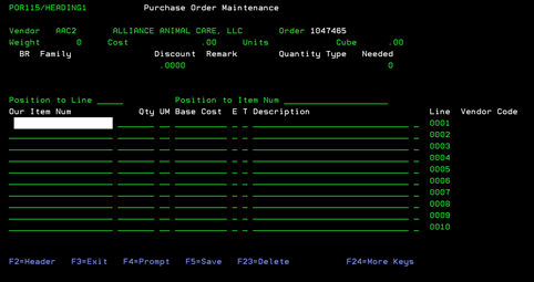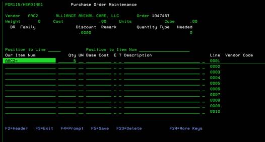 After completing the information on the first screen and pressing F5, you will be on the Purchase Order Item screen. This is where items are inputted for this Purchase Order.