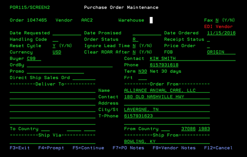 Once you enter the Purchase Order Maintenance screen, you will notice if this is an EDI Vendor by the Blinking RED “EDI VENDOR” in the upper right-hand portion of the screen as shown below. If this is an EDI Vendor, all orders will be sent via EDI. You do not need to Email/Fax this order to the Vendor. Once this order is completed & printed, it will be scheduled for EDI send. No changes can be made to an EDI Purchase Order once it has been printed. See Vendor EDI information for Buyers for more details. From here you can choose: F4-prompt (on Vendor# and Warehouse#), F5-continue, F7-PO notes, or F9-Vendor Notes.
