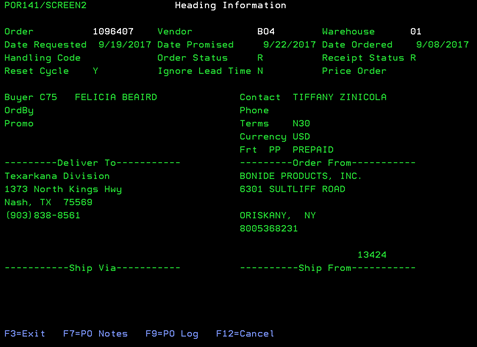 screen you can choose: (F7) PO Notes and (F9)PO Log.