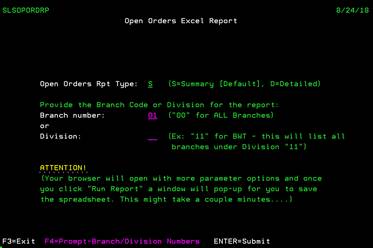 This report gives you access to the open orders currently in the system. This Open Order Report can be customized in any fashion you desire. From this screen, you can FILTER the Open Order report by Branch or Division number. If you do not know the branch number or division number, you can press F4 while on these fields to see the lookup features. You can also choose to have a Summary Report or the Detailed Report. Once your filter and report type have been selected and you have pressed ENTER, the search process begins. Please note, this program reviews all orders in the system to check for the current order status. This process can take several minutes. The report results are well worth the wait.