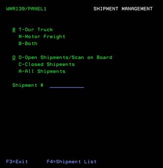 From this screen, you can FILTER the shipments shown or you can view them all. You can choose: (T)-OUR TRUCK shipments, (M)-MOTOR FRT shipments or (B)-Both shipment types. You can also choose: (O)-open shipments/scan on board, (C)-closed shipments or (A)-all shipments. You can also enter the exact Shipment# that you want to see or press the F4 key to get the shipment listing based on your selections. The Shipment# and barcode can be found on the Consolidated Package Identification Label and on the Shipment Load Master Report.